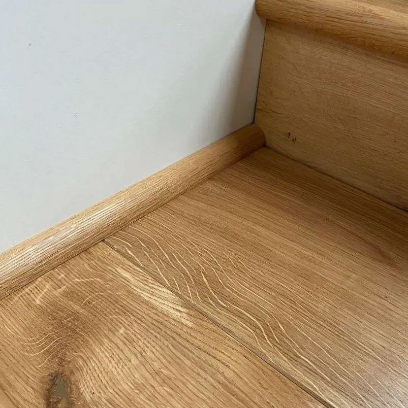 Solid oak quadrant beading in 2.7 meters length - usually fixed to the skirting board to cover the expansion gap at the edge of the flooring. Very effective.